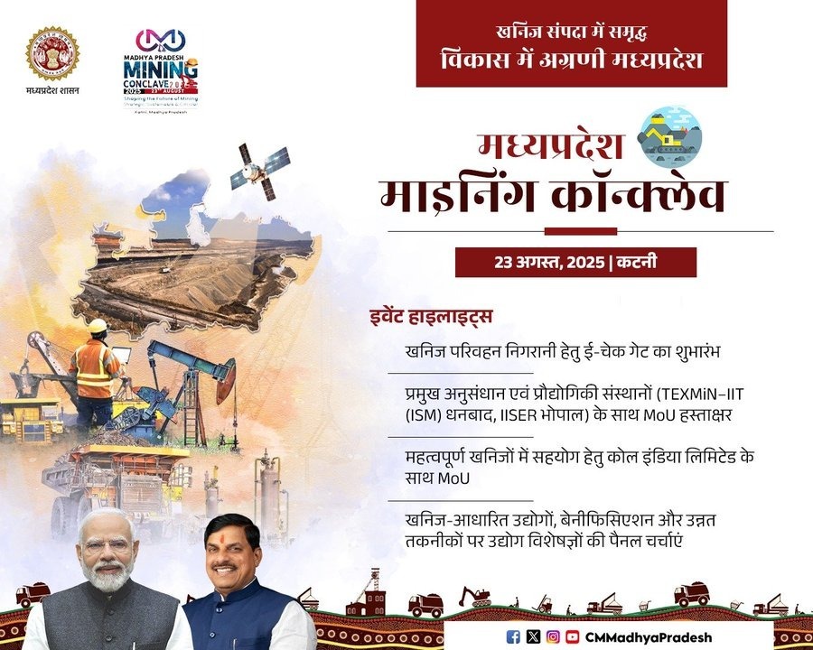 इसी कड़ी में 23 अगस्त को कटनी में होने जा रहा है ‘मध्यप्रदेश माइनिंग कॉन्क्लेव’ का आयोजन, जहां निवेशकों, उद्योग विशेषज्ञों और नीति निर्माताओं के साथ खनन के क्षेत्र में निवेश संभावनाओं पर संवाद होगा।
