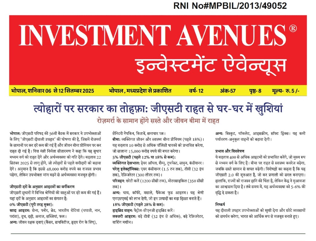 E Paper Investment Avenues E-Paper (06 September to 12 September) By Pushpendra Singh Last updated Sep 6, 2025 33 Share 18-Investment-Avenue-06-Sep-to-12-Sep EpaperInvestmentavenuesMadhya Pradeshमध्यप्रदेश सरकाररोजगार सृजन 33 Share FacebookTwitterWhatsAppPinterestEmailFacebook MessengerLinkedinTelegram